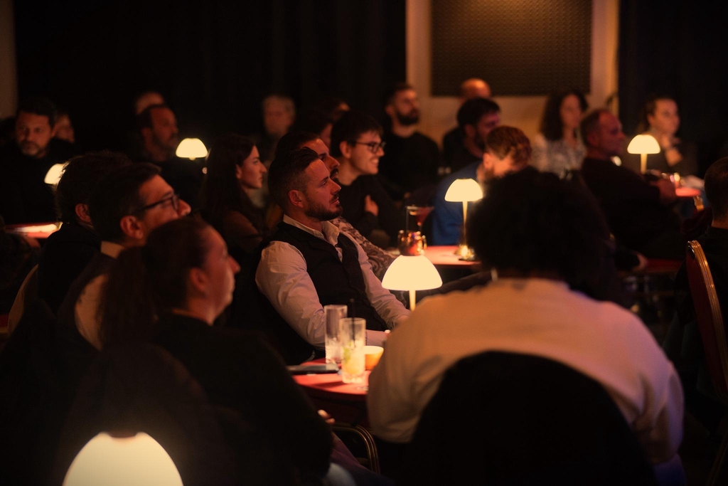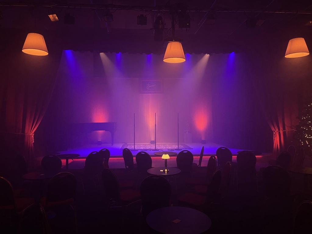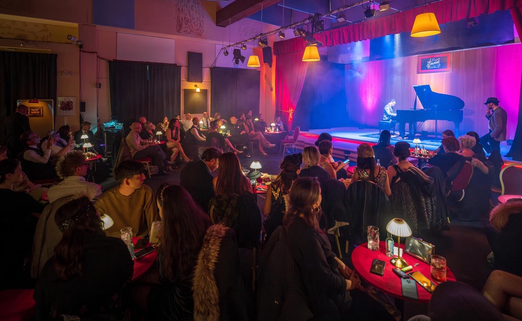 Immagina di essere in un locale anni '30, una platea fatta di tavolini ciascuno con una piccola lampada al centro, luce calda, un bancone, un palcoscenico sempre attivo, calcato da musicisti, attori, stand up comedian, serate di concerti, burlesque, jam session, cabaret, teatro.