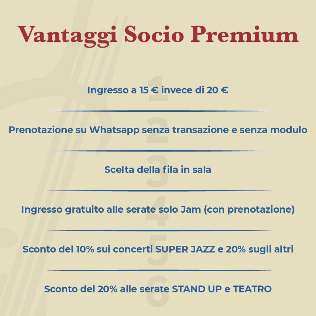 Diventando Socio Premium potrai mantenere il costo di ingresso con consumazione a 15 euro e usufruire di tanti vantaggi come ad esempio la prenotazione via Whatsapp o la scelta della posizione in sala.